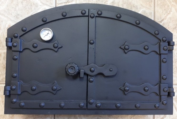 Drzwiczki chlebowe węgierskie do pieca pizza/chleb zaokrąglone żeliwne malowane czarną żaroodporną farbą o wytrzymałości do 600º. Drzwiczki posiadają termometr do 500º