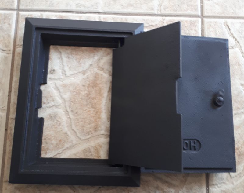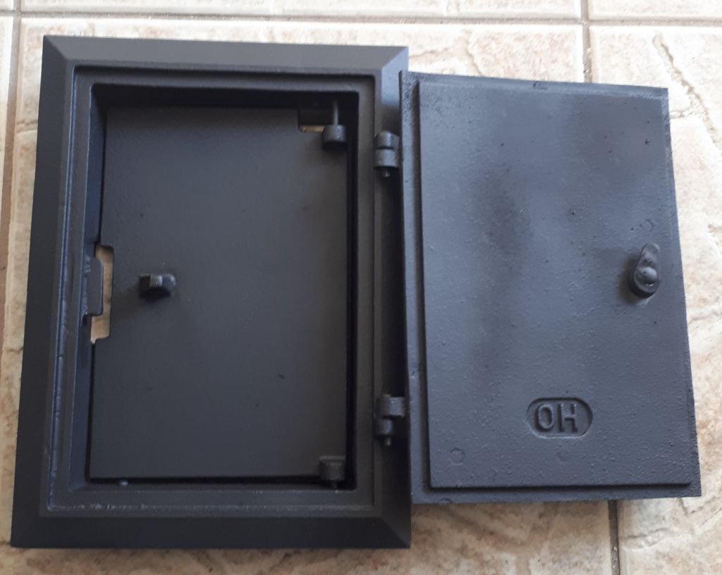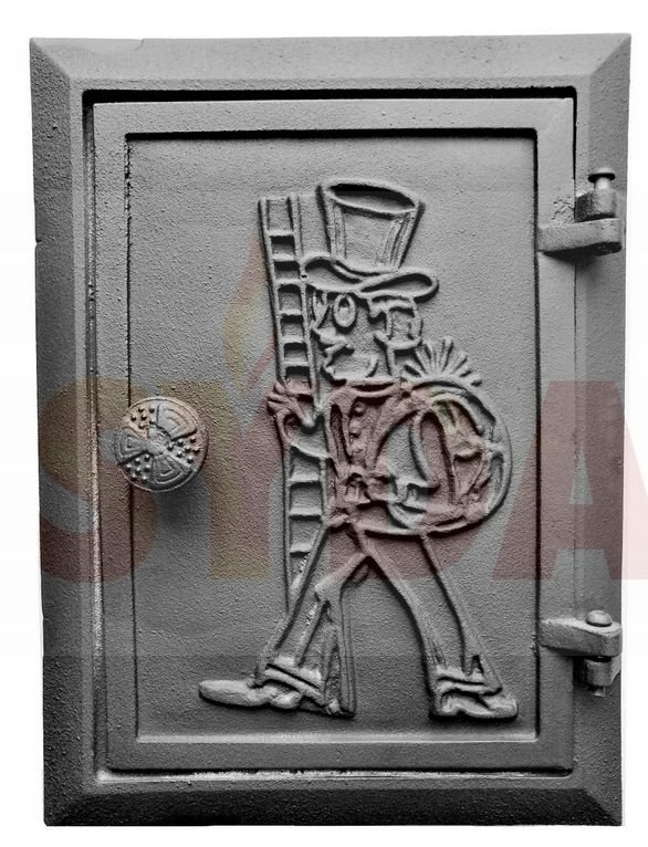 Drzwiczki kominowe wzór kominiarz żeliwne malowane czarną proszkową farbą z wkładką. Drzwiczki posiadają wewnętrzne drzwiczki z żeliwa.