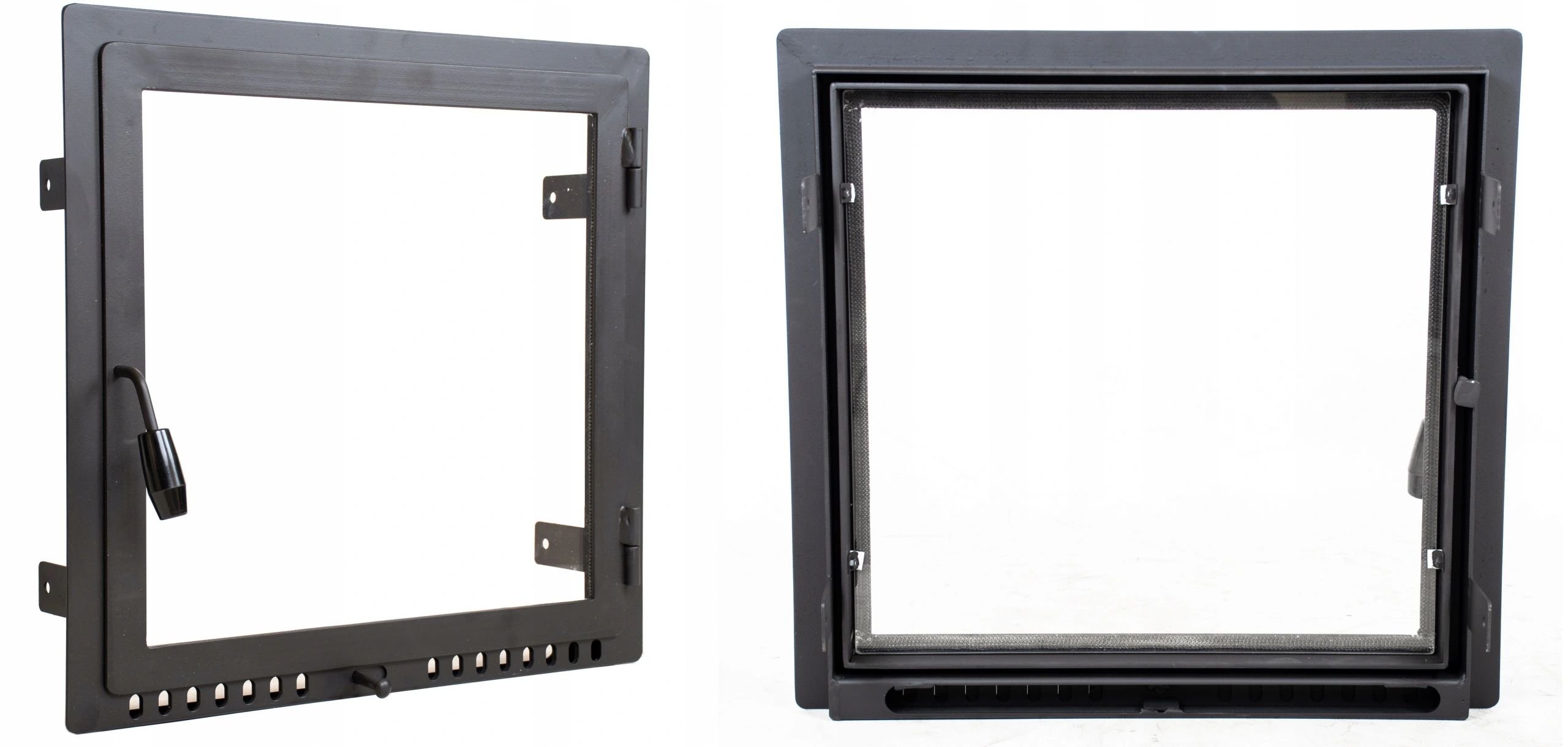Drzwiczki posiadają regulowane, dolne doprowadzenie powietrza- system "oczka". Drzwiczki malowane żaroodporną czarną farbą. Do wyboru zawias lewy lub prawy.