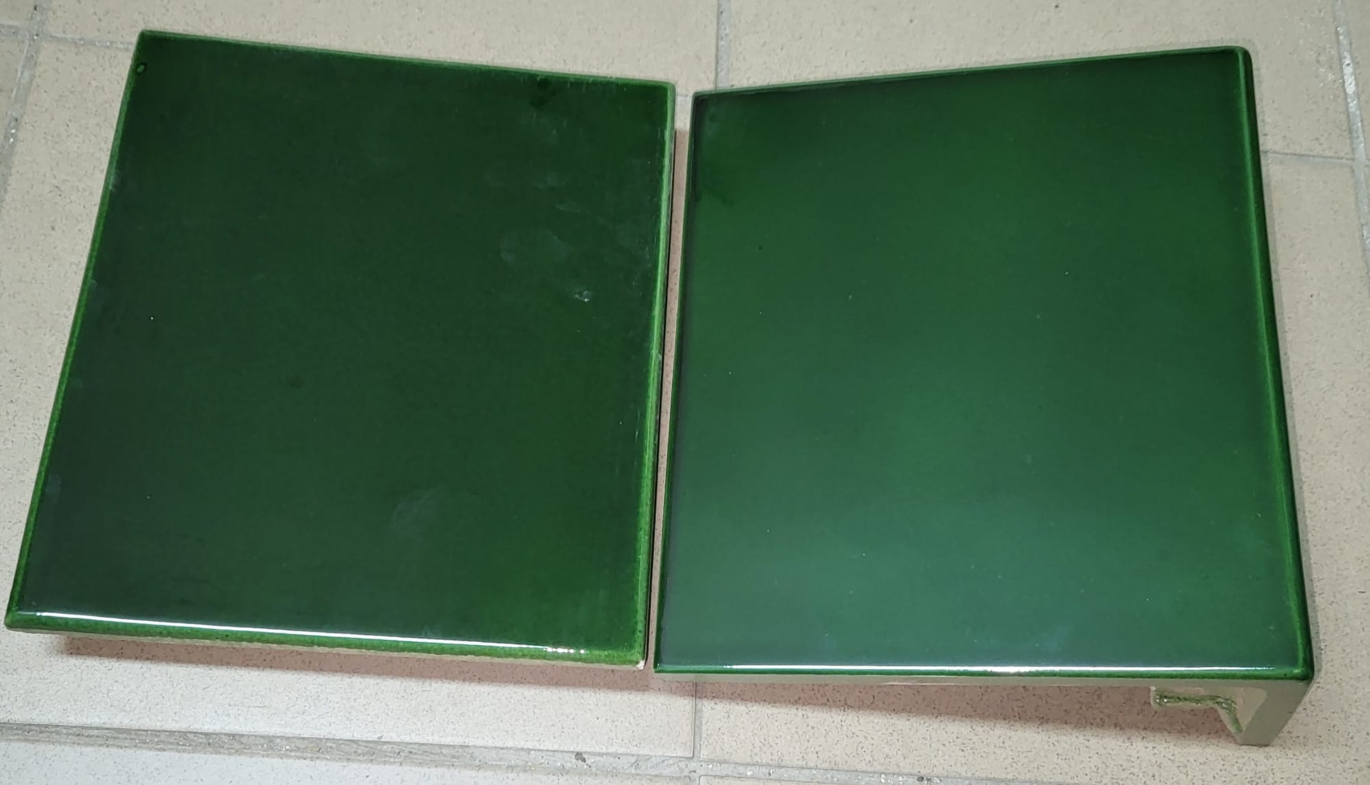 Kafle są gładkie w kolorze Zieleni trawiastej politura połysk. W tym kolorze narożniki mogą różnić się odcieniem od kafli środkowych co spowodowane jest różnicą czasu w wysychaniu kafli.