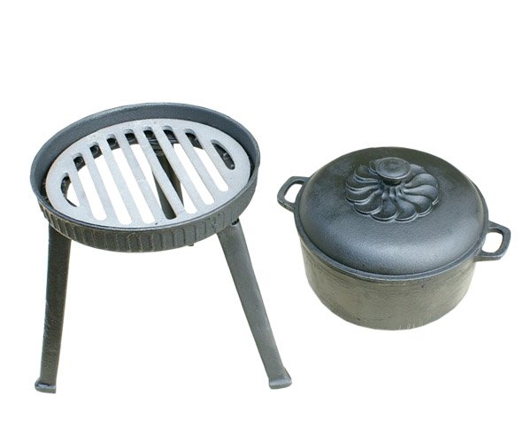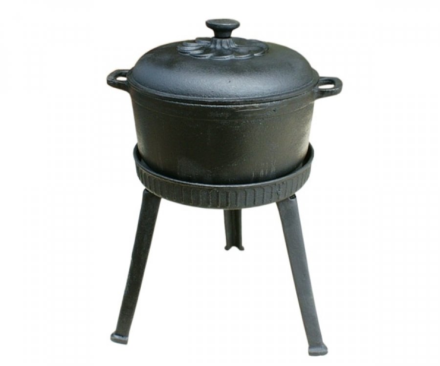Kociołek żeliwny o pojemności 7L na trójnogu żeliwnym z rusztem. Idealny do gotowania w ognisku.