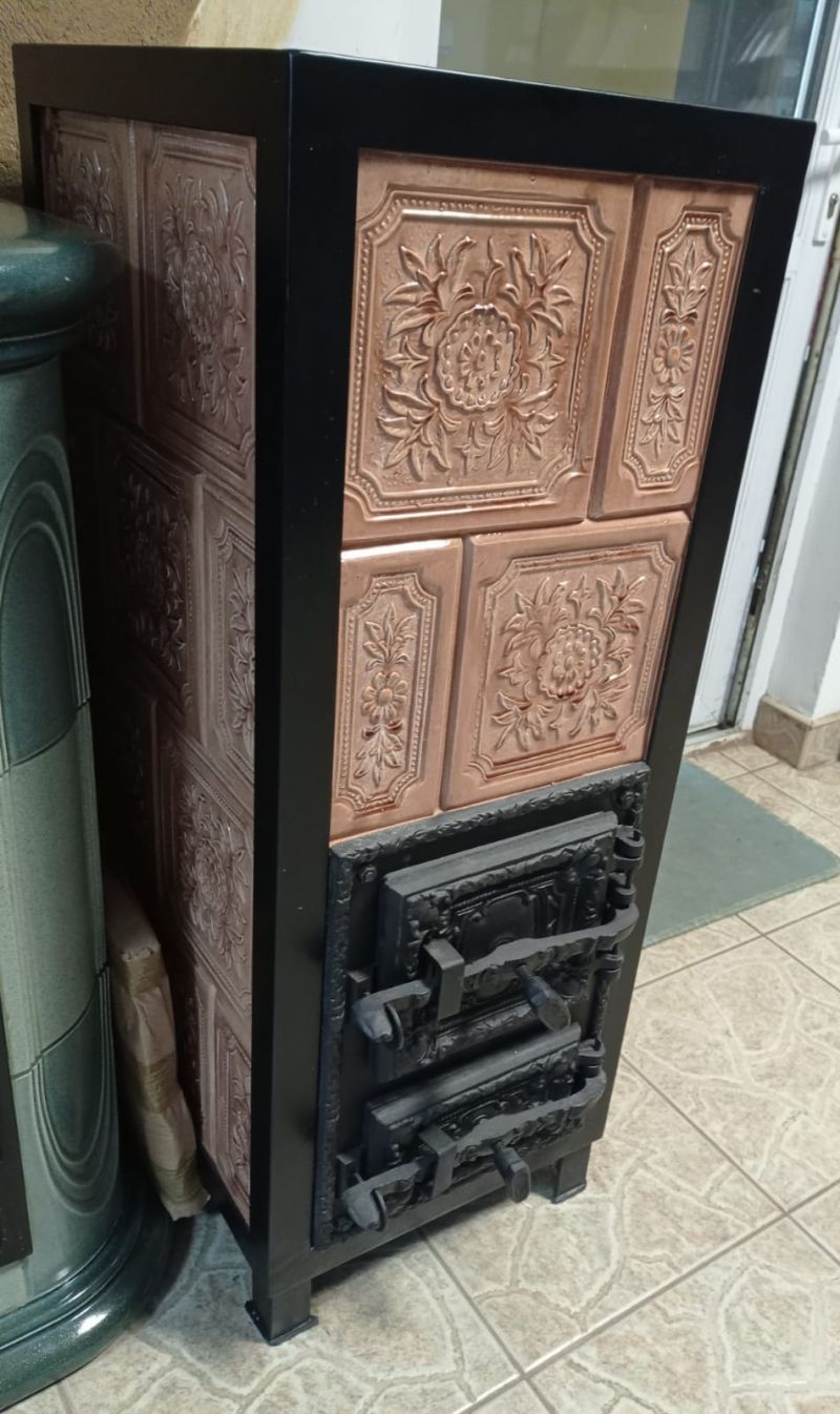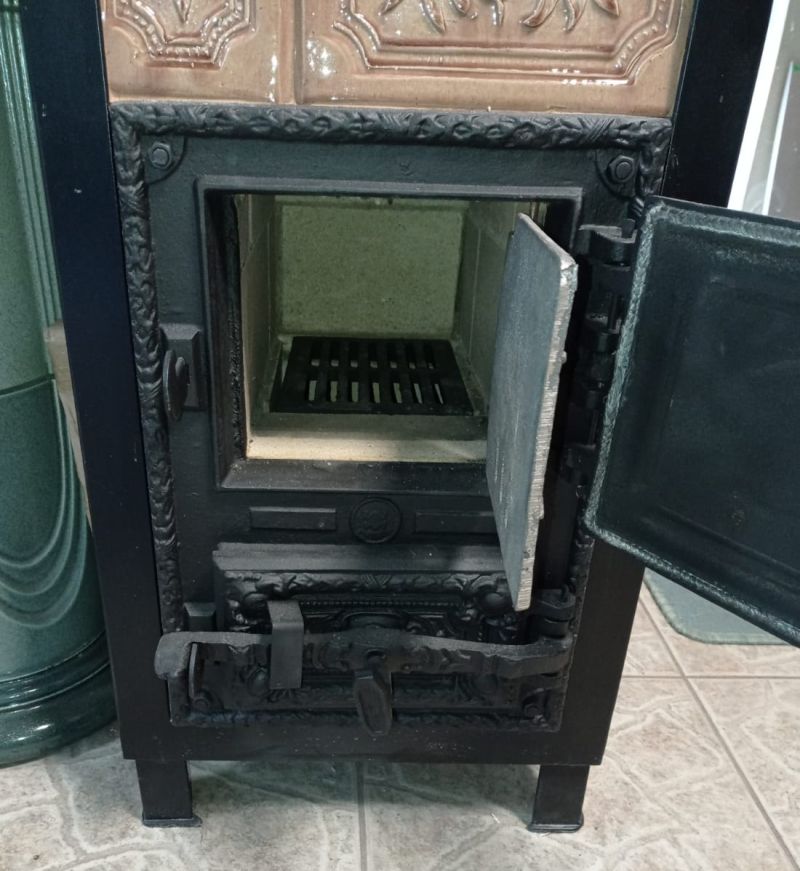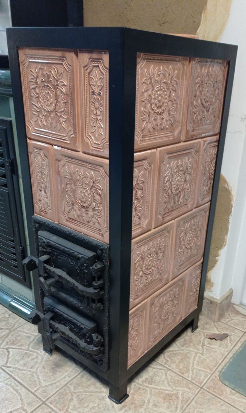 Tylko na zamówienie. Kaflowy przenośny piecyk grzewczy o mocy ok. 3Kw. Piecyk w czarnej stalowej ramce zbudowany jest kafli w odcieniu beżu z wbudowanymi drzwiczkami żeliwnymi skręcanymi śrubą w kolorze czarnym. Wylot na spaliny z tyłu w trzecim kaflu liczą dołu fi 120mm, z góry wyczystka kaflowa.