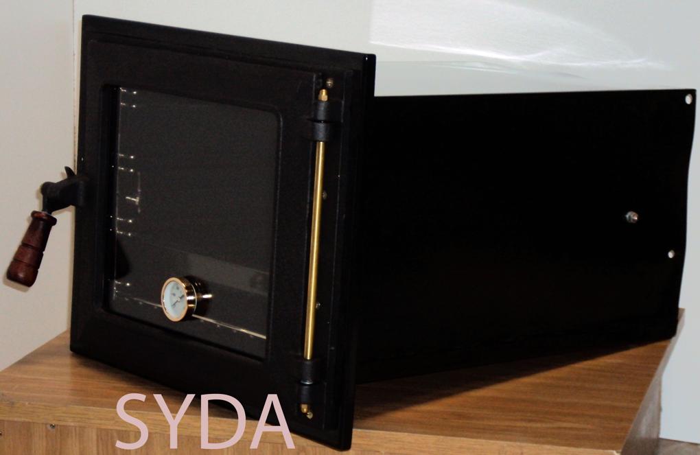 Piekarnik stalowo-żeliwny czarny (front żeliwnym + komora stalowa) dopasowany do drzwiczek scalonych z popielnikiem. Proszkowany czarną farbą żaroodporną z rączką drewnianą, zawiasami mosiężnymi, szybą i termometrem, otwierany z prawej. Możliwość przekręcenia na odwrotne otwieranie. Do piekarnika powinno się zastosować drzwiczki rewizyjne lub korek kaflowy w celu czyszczenia kanałów lub dodatkowo dobrać ramkę montażową umożliwiającą wysuwanie piekarnika https://www.syda.pl/sklep-internetowy/piekarniki/ramka-montazowa-do-piekarnika-stalowo-zeliwnego-mosiadz-detail.html