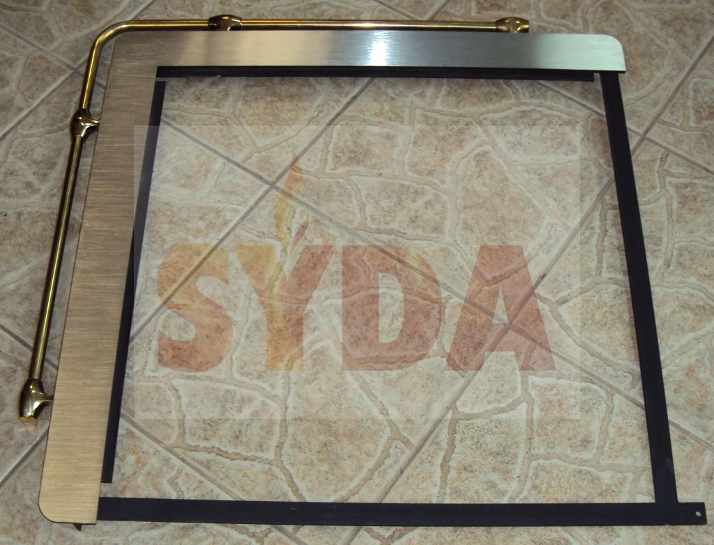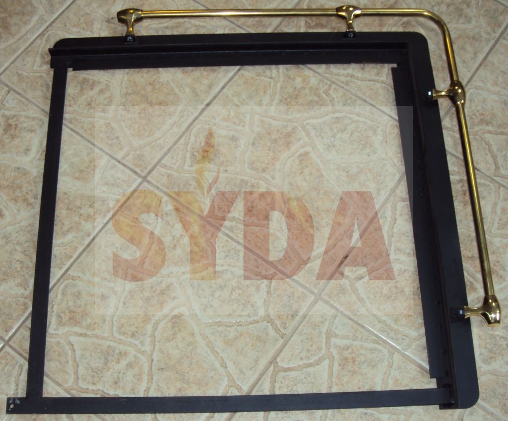 Rama kuchenna narożna z gałkami mosiężnymi i relingiem z mosiądzu, bez kątownika nad ramą. Rama wykonana z stali nierdzewnej kwasoodpornej o szerokości 65mm i grubości 4mm.